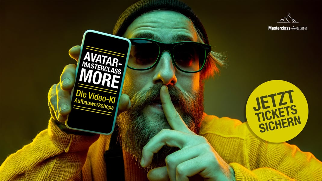 AVATAR-MASTERCLASS MORE Workshops stehen für aktuelles Wissen und hohen Praxisanteil. Jeder Workshop startet mit den jeweils besten Tools & Plattformen für Avatare und Video-KI - und nimmt sich dann schwerpunktmäßig ein Hauptthema vor.